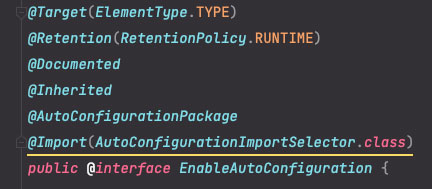 @EnableAutoConfiguration 어노테이션에 대해 조금 더 자세하게 살펴보면, 해당 어노테이션 내부에서 AutoConfigurationImportSelector 클래스를 import 하는 것을 볼 수 있는데요.