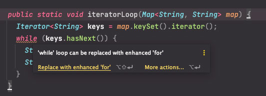 해당 방식의 경우 다른 방식들에 비해 속도도 느리게 나왔으며, 위 이미지와 같이 IntelliJ에서도 for 문으로 사용하는 것이 추천되는 것을 확인할 수 있습니다.