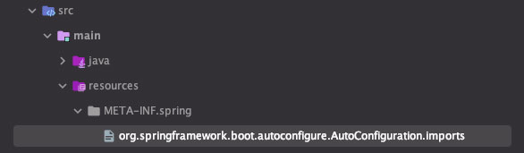 그리고 src/main/resources 하위에 META-INF/spring 디렉터리를 추가로 생성하고, 해당 디렉터리에 위 이미지와 같이 org.springframework.boot.autoconfigure.AutoConfiguration.imports 파일을 생성합니다.
