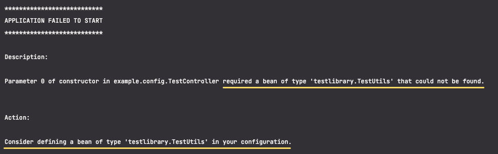 만약 bean 등록을 하지 않은 상태로 위 예시와 같이 TestUtils 클래스를 의존성 주입 방식으로 사용하려고 하는 경우 당연히 해당 빈을 찾을 수 없으며, 빈 등록이 필요하다는 결과를 만나게 됩니다.