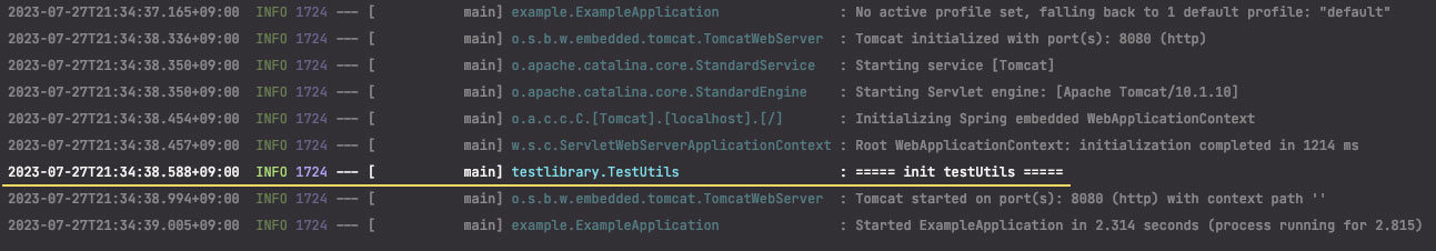 실행 결과 자동 구성이 적용되어 TestUtils에서 @PostConstruct를 적용한 init() 메서드가 동작하는 것을 확인할 수 있었고, 라이브러리를 사용하는 프로젝트에서 TestUtils에 대한 빈을 따로 등록하지 않았음에도 스프링 부트 자동 구성을 통해 TestUtils가 빈으로 등록되어 의존성 주입 방식으로 사용할 수 있게 되었습니다.