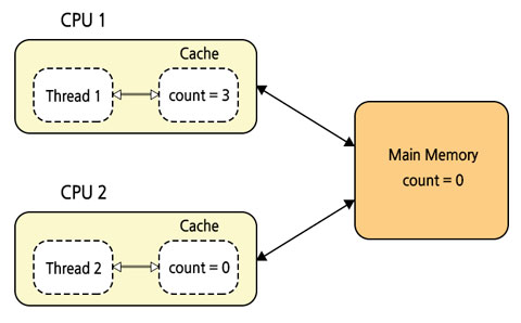 따라서 첫 번째 스레드에서 count 변수에 3이라는 값을 저장하고, 두 번째 스레드에서 count 변수 값을 가져오려는 상황에서, 만약 첫 번째 스레드에서 저장된 count 값이 main memory(count = 0)에 저장되지 않은 상태라면 두 번째 스레드에서는 업데이트되지 않은 값(count = 0)을 읽어올 수 있습니다.