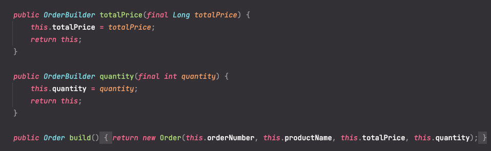 위 코드와 같이 Lombok을 사용하면 직접 빌더 관련 코드를 구현할 필요 없이 @Builder 어노테이션만 적용하여 빌더 패턴을 사용할 수 있으며, 대부분 이러한 방식으로 빌더를 자주 사용하고 계실 거라고 생각됩니다.