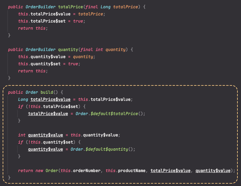Order 클래스에 @Builder를 다음과 같이 사용했을 때는 위에서 컴파일된 Order.class와 다르게 set 여부 확인 및 기본 값을 넣어주는 부분이 없다는 것을 볼 수 있었는데요.