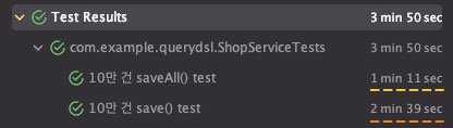 saveAll() 메서드를 통해 데이터를 저장하는 방식이 save() 메서드를 반복문을 돌려 저장하는 방식에 비해 절반 정도의 시간이 소요되는 것을 확인할 수 있었습니다.
