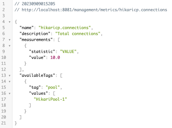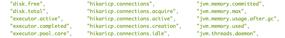 '/metrics' endpoint를 통해 실행 중인 애플리케이션의 jvm memory, jvm thread, process cpu, disk, database connections, tomcat sessions 등 다양한 종류의 메트릭이 제공되는 것을 확인할 수 있는데요.
