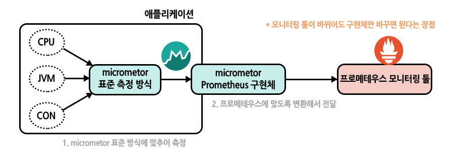 마이크로미터는 '애플리케이션 메트릭 파사드'라고 불리는데, 애플리케이션의 metric(측정 지표)을 micrometor가 정한 표준 방법으로 모아서 제공합니다.