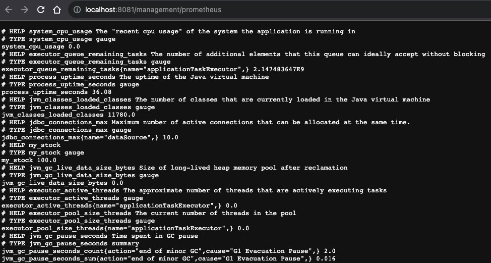 위 의존성을 추가하면 프로메테우스에 metric을 전달하기 위한 '/prometheus'라는 endpoint가 생기고, 해당 endpoint에 접근하면 다음과 같은 데이터를 볼 수 있습니다.