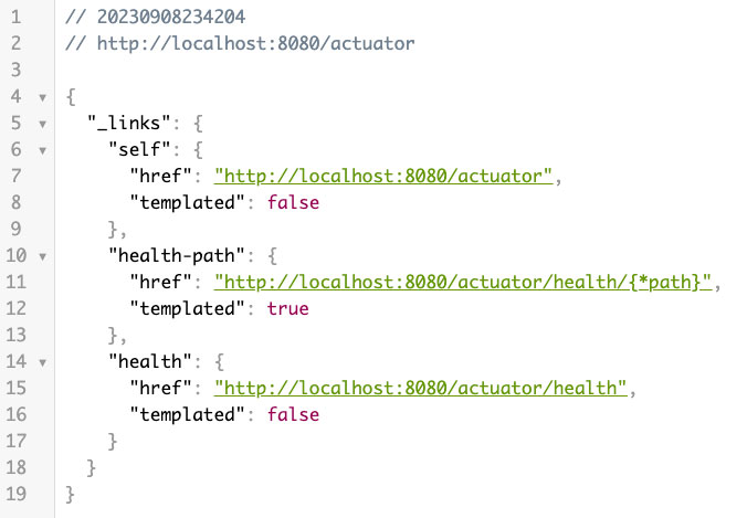 위 의존성만 추가하면 spring boot actuator가 바로 활성화되며, 의존성 추가 후 애플리케이션을 실행하여 '/actuator' 경로로 요청하면 다음과 같이 actuator에서 기본적으로 노출된 기능(health)을 볼 수 있습니다.