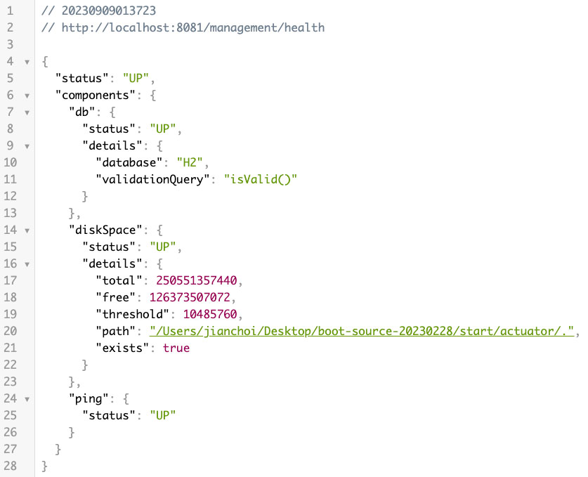 이 상태 값은 단순히 애플리케이션이 요청에 응답할 수 있는지 판단하는 것을 넘어서 애플리케이션이 사용하는 데이터베이스가 응답하는지, 디스크 사용량에는 문제가 없는지 등의 정보를 종합해서 판단됩니다.