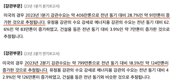 실제로 2023년 3월 분기 보고서와 6월 반기 보고서의 내용을 살펴보면, 2023년 1분기 미국의 강관 수요는 약 406만 톤으로 전년 동기 대비 약 28.7% 증가, 2023년 2분기 강관 수요는 약 799만 톤으로 전년 동기 대비 약 18.5% 증가하였는데요.