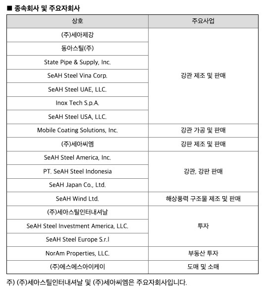 세아제강, 세아씨엠, 세아스틸인터내셔날, 에스에스아이케이를 자회사로 두고 있으며, 해당 자회사 4개사 외 해외 계열사까지 포함하여 총 18개의 종속회사를 두고 있습니다.