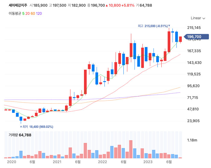 2023년 9월 현재 세아제강지주의 주가는 2020년 코로나로 인한 주가 급락 시기 대비 10배 가량 상승한 상태입니다.