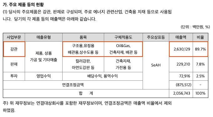 주요 제품 등의 현황 부분을 살펴보면, '전체 매출의 약 90%가 강관으로부터 나온다는 것'을 확인할 수 있습니다.