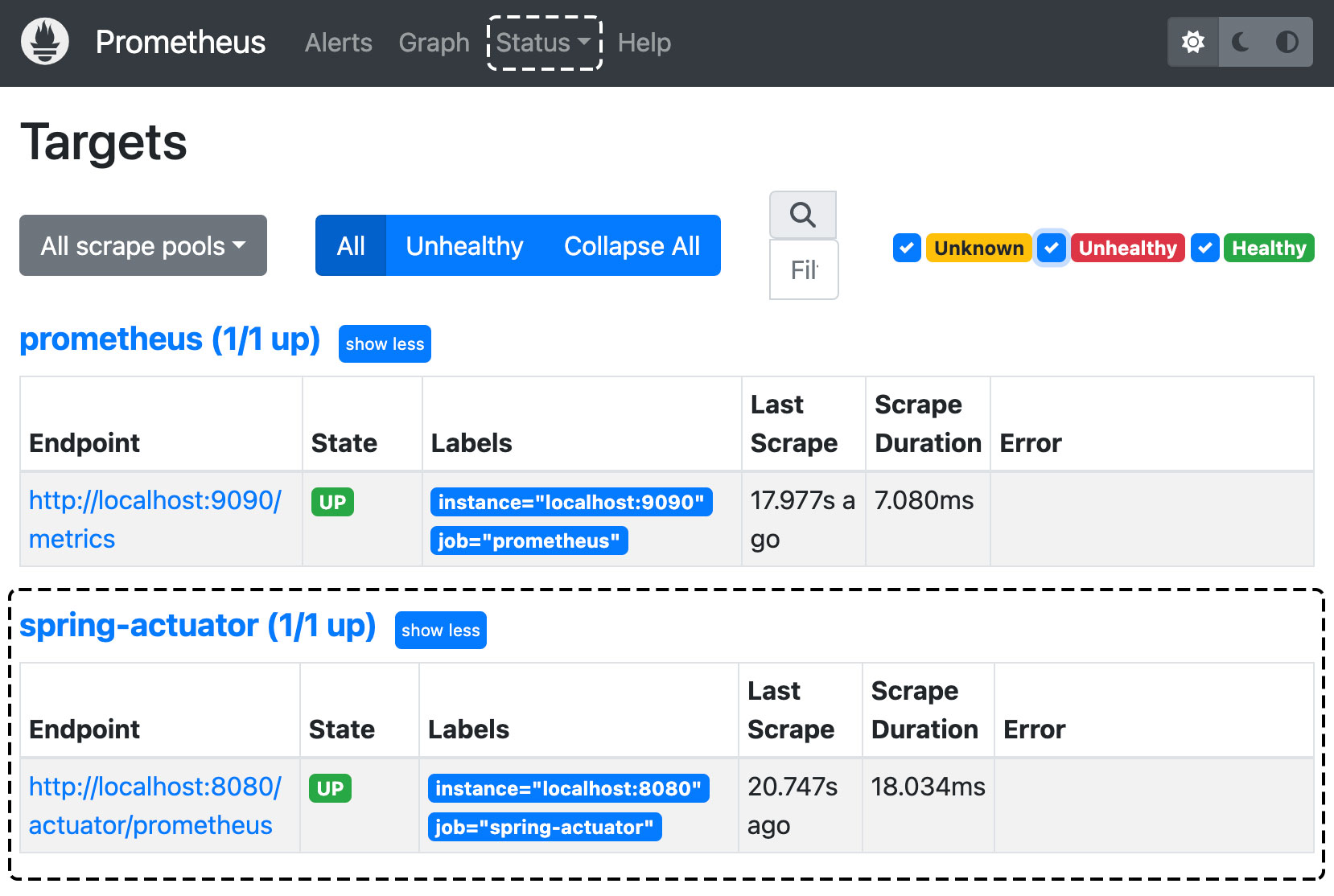 yml 파일 설정 후 프로메테우스를 재가동하고 해당 포트(9090 port)로 들어가 보면 'Status -> Configuration'를 통해 yml 파일에 추가한 데이터를 확인할 수 있고, 'Status -> Targets'에서 모니터링 대상에 추가한 spring actuator가 동작하고 있는 것을 확인할 수 있습니다.