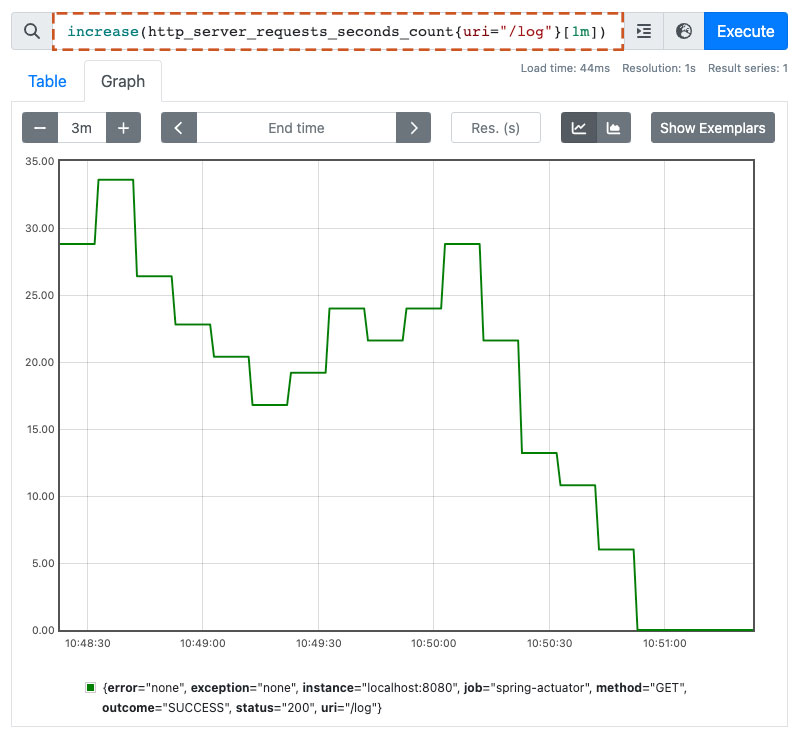 위와 같은 카운터 측정 결과는 계속 증가하기만 하기 때문에 '특정 시간에 대한 메트릭 값을 확인하기가 어렵다는 단점'이 있습니다.