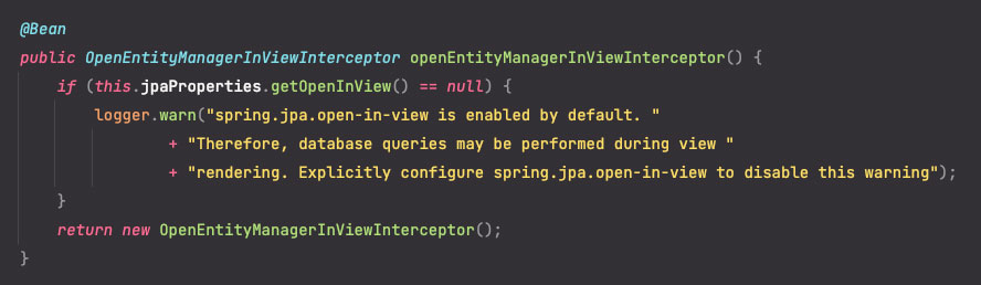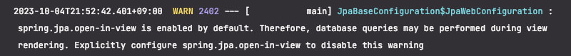 때문에 JpaWebConfiguration class에서 보는 것과 같이 open-in-view 옵션을 명시하지 않았을 때 아래와 같은 경고 로그를 출력하게 됩니다.