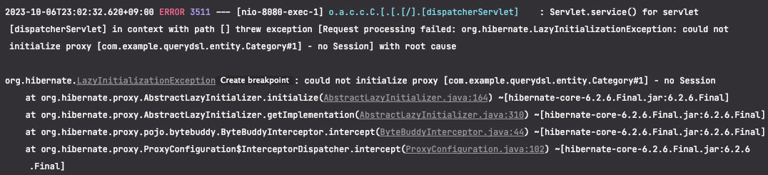 때문에 다음과 같이 트랜잭션 범위 밖인 Controller 단에서 Product, Category의 연관 관계를 통해 Category Entity의 필드에 접근하게 되면 아래와 같이 'LazyInitializationException: cloud not initialize proxy' 예외가 발생하게 됩니다.