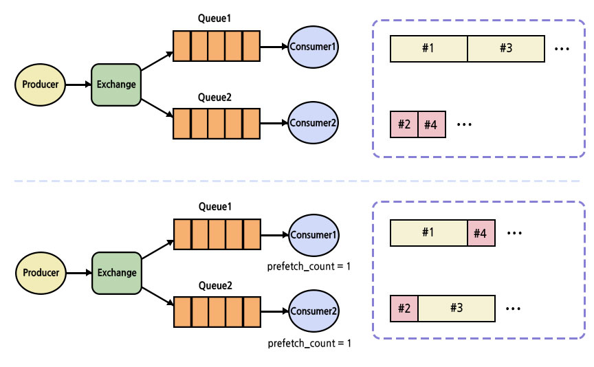 예를 들어 하나의 Queue에 두 개의 Consumer가 존재하고, 이 두 개의 Consumer에는 Round-Robin 방식으로 메시지가 분배됩니다.
