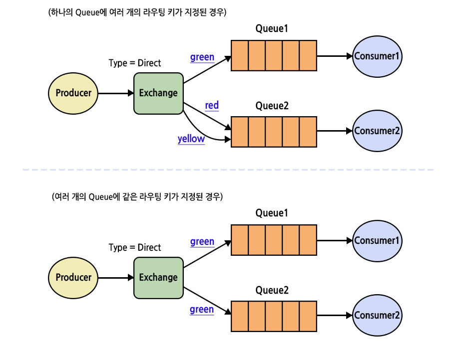이미지와 같이 하나의 Queue에 여러 routing key를 지정할 수 있고, 여러 Queue에 같은 routing key를 지정할 수도 있습니다.