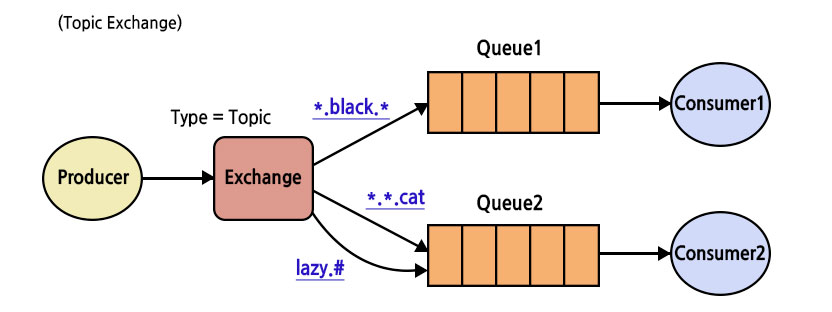 메시지에 포함된 routing key의 패턴을 이용하여 메시지를 라우팅 하는 방식으로, 키 전체가 일치하거나 일부 패턴과 일치하는 모든 Queue로 메시지가 전달됩니다.