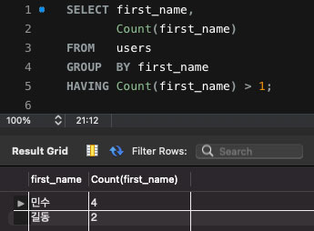해당 결과는 위 users 테이블의 first_name(이름)에 대한 중복 데이터를 조회한 예시입니다.