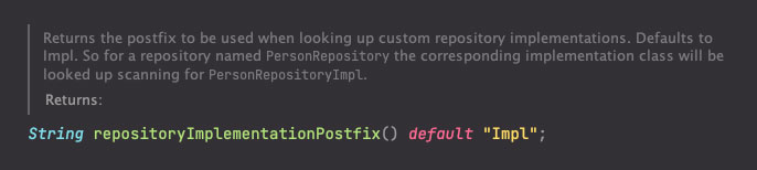 다음은 @EnableJpaRepositories의 코드 중 일부로, repositoryImplementationPostfix의 default 값이 'Impl'로 설정되어 있는 것을 확인할 수 있습니다.
