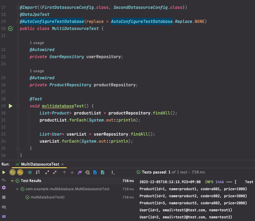 @DataJpaTest를 통한 각각의 데이터베이스가 잘 연결되었는지 테스트하였으며, 각각의 datasource에서 등록한 bean을 스캔하기 위해 test 패키지에 config 파일을 등록하고 @Import 하였습니다.
