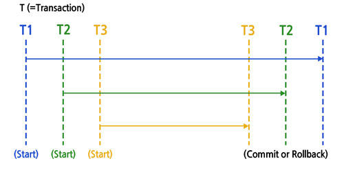 이러한 방식으로 인해 '지정된 순서대로 트랜잭션을 시작하고 역순으로 커밋 or 롤백을 한다는 특징'이 있습니다.