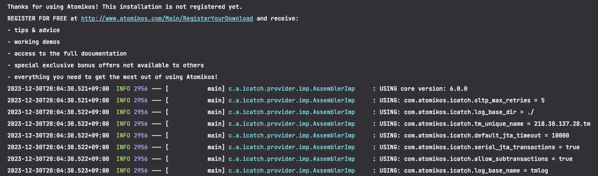 여기까지의 구현이 정상적으로 되었다면 프로젝트 실행 시 다음과 같이 'Thanks for using Atomikos!'라는 메시지와 함께 atomikos와 관련된 설정 내용이 로그로 찍히는 것을 확인할 수 있습니다.