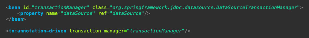 <bean id="transactionManager" class="org.springframework.jdbc.datasource.DataSourceTransactionManager">