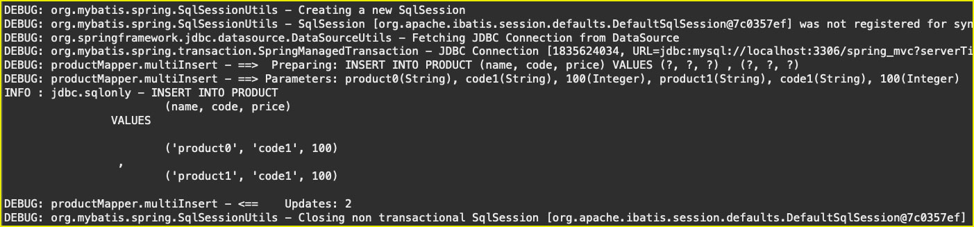 실제 로그에서도 같은 방식의 쿼리가 실행되는 것을 확인할 수 있으며, foreach 문을 활용한 방식의 경우 한 번의 insert로 데이터를 처리하기 때문에 데이터가 몇 건인지 상관없이 'SqlSession'에 대해 'Creating a new SqlSession' -> 'Closing non transactional SqlSession' 과정이 한 번만 발생한다는 것을 확인할 수 있습니다.