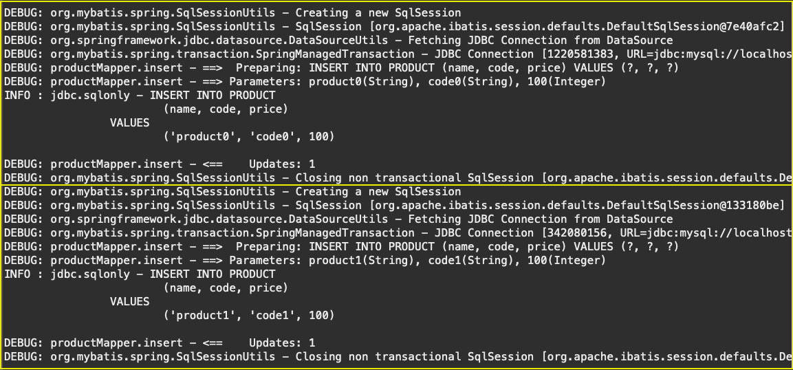 보시는 것처럼 2건의 데이터에 각각에 대해 insert 쿼리가 실행되며, 각 insert 쿼리에 대해 'Create a new SqlSession' -> 'Closing non transactional SqlSession'가 반복되며 'SqlSession'을 생성하고 닫는 것을 볼 수 있는데요.