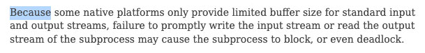 공식 문서에 따른 주의할 점으로는 플랫폼에 따라 'InputStream', 'OutputStream'에 대해 버퍼 크기 제한이 있을 수 있기 때문에 프로세스 실행 후 InputStream, OutputStream에 대한 적절한 처리가 이뤄지지 않는 경우 버퍼가 넘쳐 프로세스가 멈추거나 deadlock 상태에 빠질 수 있다는 것입니다.