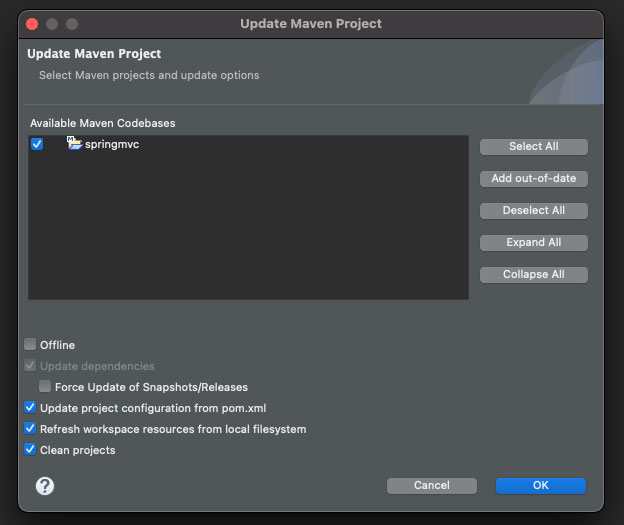 의존성까지 추가가 되었다면 이어서 '프로젝트 우클릭' -> 'Maven' -> 'Update Project...' 과정을 진행합니다.