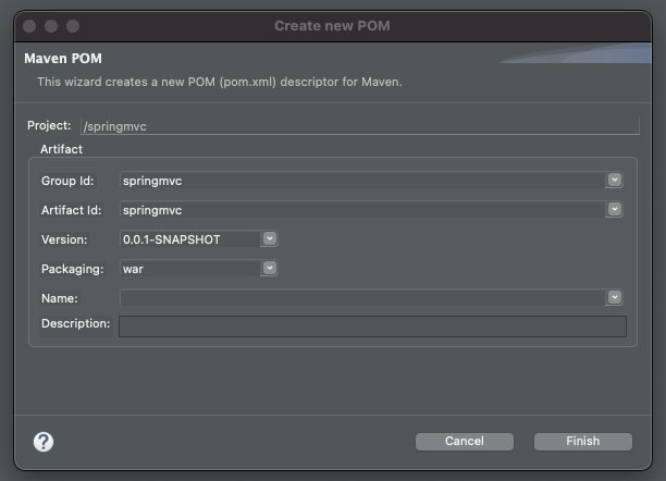 변경 방법은 '프로젝트 우클릭' -> 'configure' -> 'Convert to Maven Project'를 실행하면 위 이미지와 같은 'Create new POM'이 나오며, 생성을 완료하면 프로젝트 경로 맨 하단에 'pom.xml' 파일이 생성됩니다.