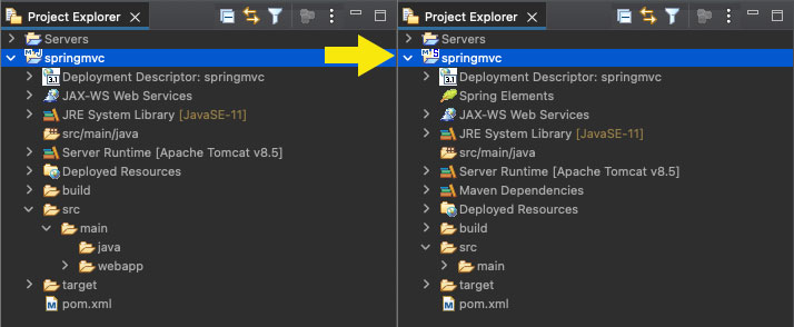 업데이트가 정상적으로 진행되면 프로젝트 아이콘이 'J' -> 'S'로 바뀌고 'Spring Elements'라는 것이 추가되면서 프로젝트가 스프링 프로젝트로 바뀌는 것을 확인할 수 있습니다.