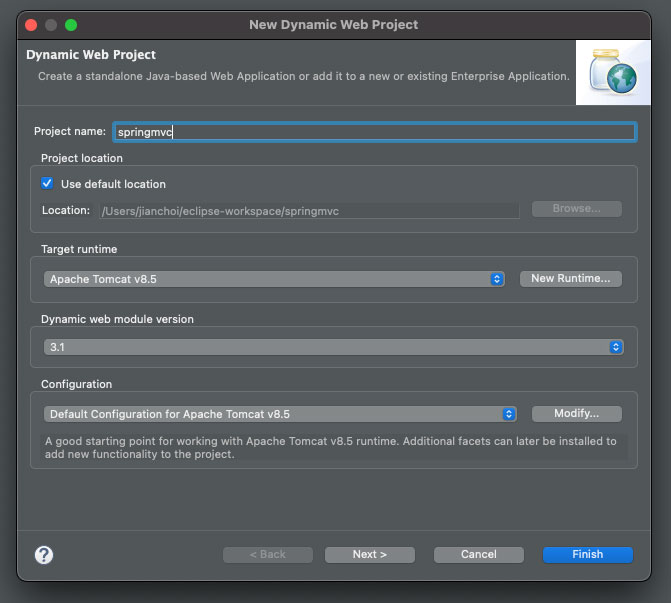 생성 과정에서는 'New Runtime...' 버튼을 통해 사용할 톰캣 버전과 해당 버전이 설치된 경로(Tomcat installation directory)를 설정해 주면 Target runtime이 지정되고, 해당 runtime에 맞는 'Dynamic web module version', 'Configuration'이 자동으로 설정됩니다.