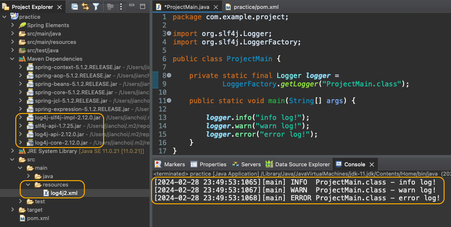 프로젝트에서 /src/main/resources/ 경로에 log4j2.xml 파일이 정상적으로 존재하며, 이클립스 환경에서 실행 시 다음과 같이 정상적으로 로깅이 되는 것을 확인할 수 있는데요.