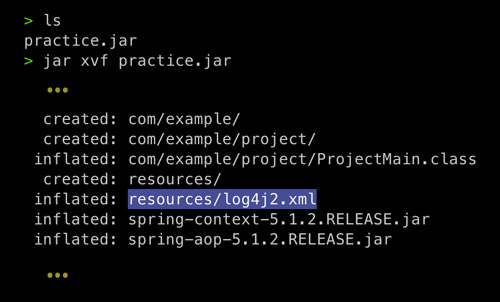 // 1. jar 명령어를 통해 log4j2.xml 파일을 '/' 경로에 추가