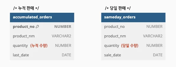 예를 들어 다음과 같이 '누적 판매(accumulated_orders)' 테이블과 '당일 판매(sameday_orders)' 테이블이 있을 때, '상품 번호(product_no)'를 비교하여 누적 판매 테이블에 해당 상품 번호로 누적 판매된 데이터가 있을 경우 데이터를 update 하고, 없을 경우 새로운 데이터를 insert 하는 merge into 구문을 위와 같이 구현할 수 있습니다.