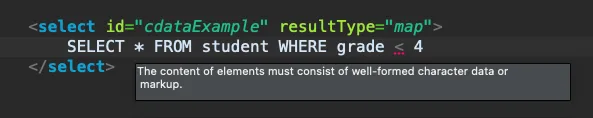 예를 들어 설명하자면, MyBatis에서 위 예시와 같은 SQL 쿼리를 실행하게 되는 경우 XML Parser에 의해 WHERE 조건 절의 부등호 '<'가 태그의 시작점으로 인식되어 아래와 같은 'SAXParserException'이 발생하는데요.