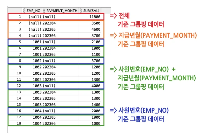 만약 '1. 사원번호를 기준으로 그룹화된 집계'를 제외하고 2번과 3번 집계 내역만 조회하고 싶을 경우 다음과 같이 (EMP_NO, PAYMENT_MONTH)를 괄호로 묶어 사용할 수도 있습니다.
