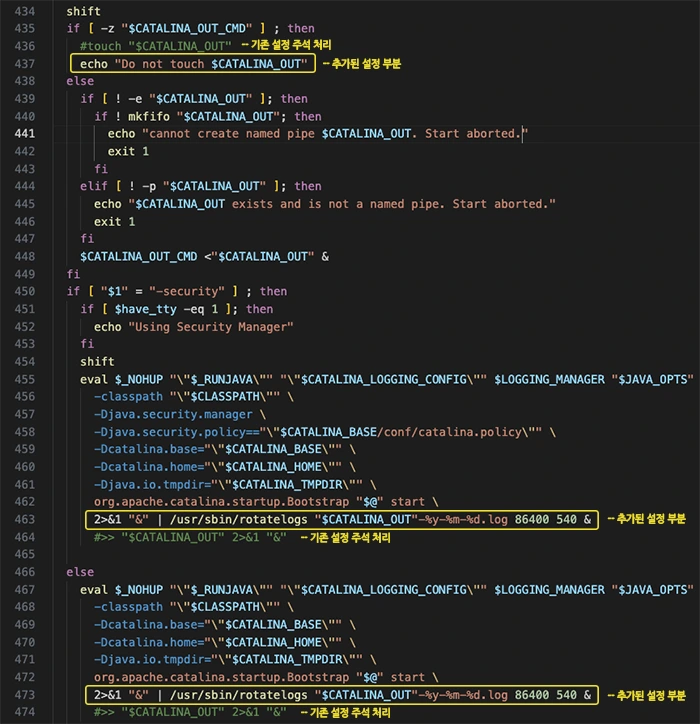 또한 464, 474 라인의 >> "$CATALINA_OUT" 2>&1 "&" 부분을 주석처리하고 아래 부분을 추가로 입력합니다.
