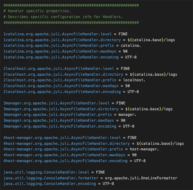그 외에 로그 파일(catalina.yyyy-mm-dd.log, localhost.yyyy-mm-dd.log, manager.yyyy-mm-dd.log, host-manager.yyyy-mm-dd.log)의 경우 {INSTANCE_DIR}/conf/logging.properties 설정 파일의 해당 부분을 통해 불필요한 로그 파일에 대한 내용을 주석처리 함으로써 로그 파일이 생성되지 않게 처리할 수 있습니다.