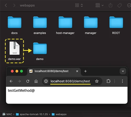 그 이유는 외장 톰캣에 요청 경로에 대한 설정을 따로 하지 않았기 때문에 요청 경로 가장 앞에 war 파일의 이름(여기서는 '/demo')이 경로로 추가되기 때문입니다.
