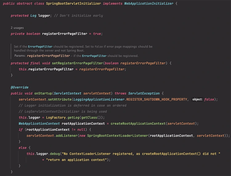 그리고 Spring에서는 Servlet 3.0 이상의 환경에서 ServletContext를 프로그래밍적으로 다룰 수 있는 WebApplicationInitializer 인터페이스를 제공하였으며, 위 과정에서 사용된 SpringBootServletInitializer 추상 클래스는 WebApplicationInitializer 인터페이스의 구현체입니다.