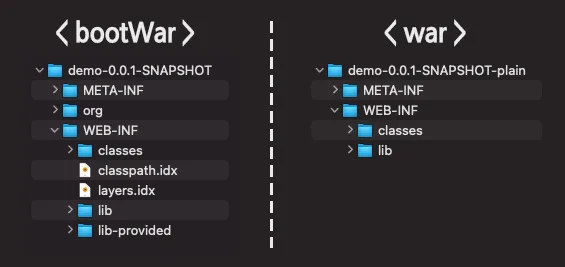 build.gradle 파일에 수정 사항을 적용한 후 bootWar, war를 통해 war 파일을 각각 빌드해 보면 bootWar와 war는 다음과 같은 구조 차이를 가지게 되는데요.