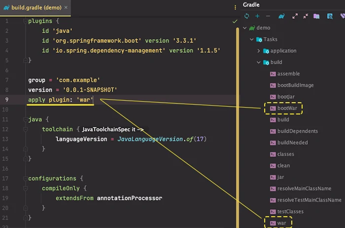 apply plugin: 'war' 설정이 추가되면 gradle의 build 툴에 'bootWar', 'war' 기능이 추가로 생긴 것을 확인할 수 있는데요.