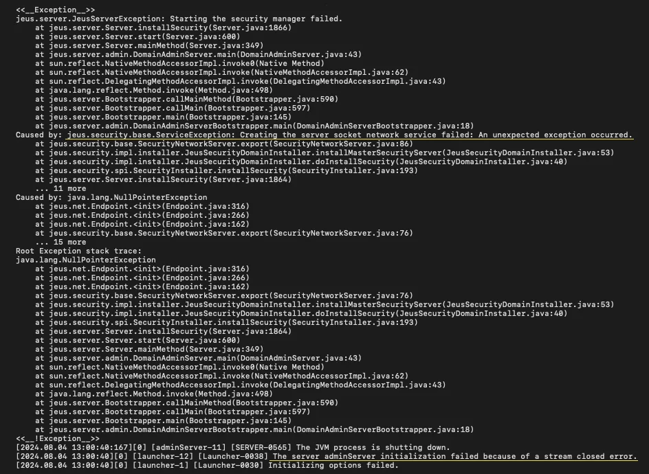 Exception의 주원인은 'jeus.security.base.ServiceException: Creating the server socket network service failed: An unexpected exception occurred.' 부분으로 보이며 내용을 조금 더 찾아보기 위해 Exception이 발생한 위쪽 로그를 살펴보았습니다.